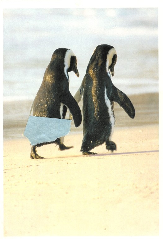 When we got home, I found the penguin card, tore the edge of the envelope off and fashioned into the shape of a diaper and pasted it back on the card. Clever huh?