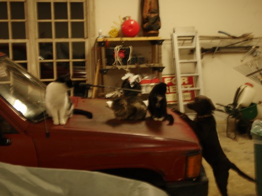 In the picture above is my garage and my 1986 Toyota truck, my first air-conditioned car that I bought in residency in Augusta, Ga to use to moonlight in Millen, Ga for extra money. On the truck are our three cats, in order from right to left, Kitten, Annie, and Kibber. On the hood is Penelope as a puppie. Penelope is there to eat cat food. My wife had the habit of feeding the cats their” three cans of “stinking can” cat food on the hood of my beloved truck.  When I would come home at night, if I walked by the truck, the cats would congregate there hoping to be fed. Penelope loved the canned cat food as well and that explains why she is there. Sadly, Kibber and her daughter Annie have passed away since this picture was taken. The picture says so much however about my life at the time. The sprayer, the ramp for my John Deere lawnmower, the for rent sign for the many failed property investments I’ve made, in the foreground the covered 65 Mustang, my cats, Penelope, old golf clubs that a patient gave me that I never use, an air tank that doesn’t work or hold enough pressure to be of use and the seeder I don’t use because my wife did not like how I kept the yard so is not used because we now pay someone to do that, and if you look closely on the driver’s side of the hood is an old broken fishing rod I found and have on a magnetic  rod holder that attaches to the roof and hood to hold rods without having to break them  down between rivers, I save old rods for the guides to use to repair other rods…the………………