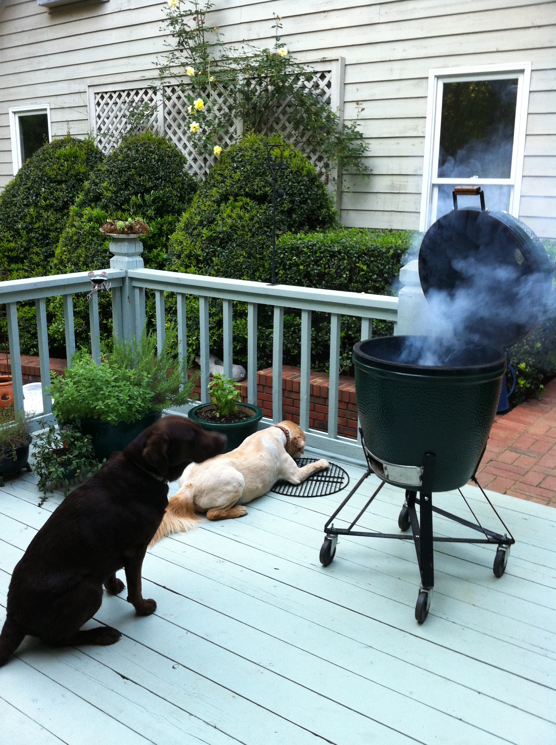 penelope goes over to lick the stuff off the grate from the night before (don’t freak out..if i cook on it it will be sterilized by the heat of the coals when i put the grate back on the greeen egg…chilll