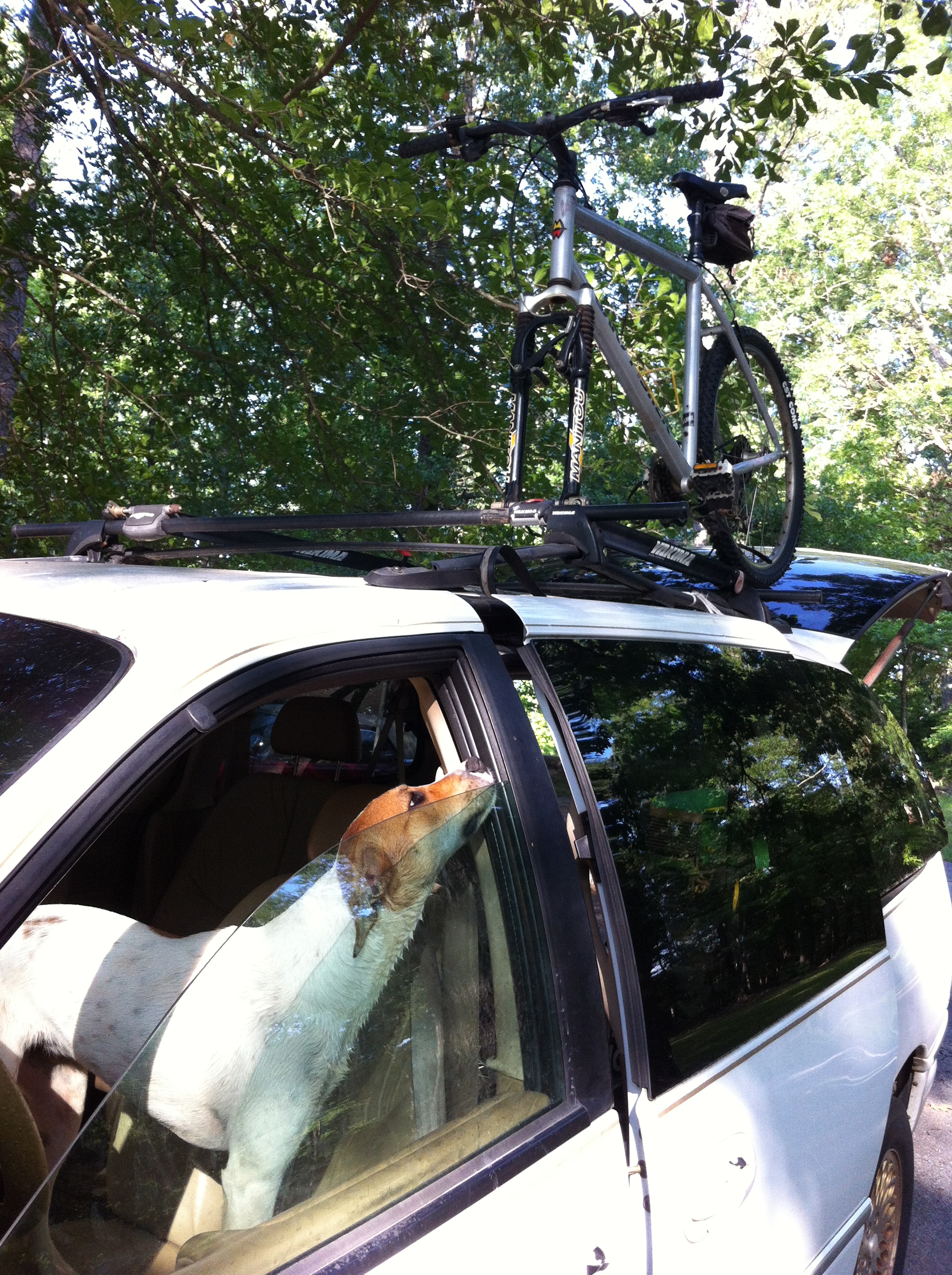 So I give my Explorer to the child that turned 16 and I get the van. I “Man it Up” with a on top bike carrier and that doubled as my Kayak holder and I’ve been it ever since. Well, except when my youngest son took it on a tour of the U.S. for his band Sunglasses. Anyway I have it again and I was off this past Memorial Weekend and because I rarely have time off, I was bored as hell come about Sunday afternoon and worried about what in the hell am I going to do on Monday. I begin to look around the garage and see my mountain bike. The last time I had ridden it was before my prostate surgery back in May of 2007. It is 90 degrees here these days and after lunch I go out to size it up. Flat tires, spider webs everywhere, still had a little bag under the seat with bike tools in it.