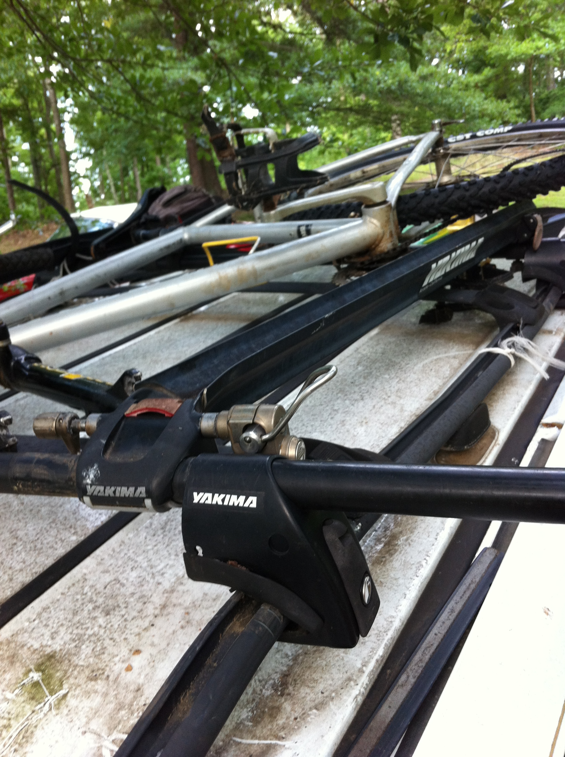 I am listening to this part of story on my way home from Chicopee Woods about the time the story gets to the part of train going over the Rearden’s Steel Bridge I am pulling into my home. As I often do with books that I listen to, I will either slow down to be I finish a chapter or sit in the car to get past an interesting part. In this case I was dying to know if the steel was a success and that Rearden would be rich and famous. Just I am pulling down the driveway and then into garage and as the train makes its way to the mid portion and the author saying that the bridge is beginning feel the stresses of the power and weight of the train…my car with the bike on the top crashes into the garage. It scared the hell out of me. At first I thought it was the sound effects from the train breaking the steel and crashing down into the gorge the bridge crossed. No, it was me running my bike into my house. The force of the crash broke the handle bar off the bike, bent the tire and pulled the luggage rack up and away from the car. There was dent and discoloration of the framing of the opening of the garage. The bike was now stuck between the van and the garage and with some trepidation I backed the van out and away further damaging all the points of the collision.
